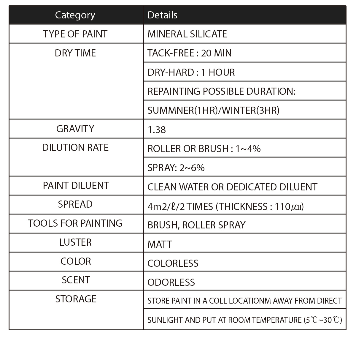 This product consists of mineral pigments and silicate resin for the building purpose with water paint. Since it is made of strong-alkali materials, it has outstanding effectiveness on sterilizing germs and any other unhealthy materials to human.